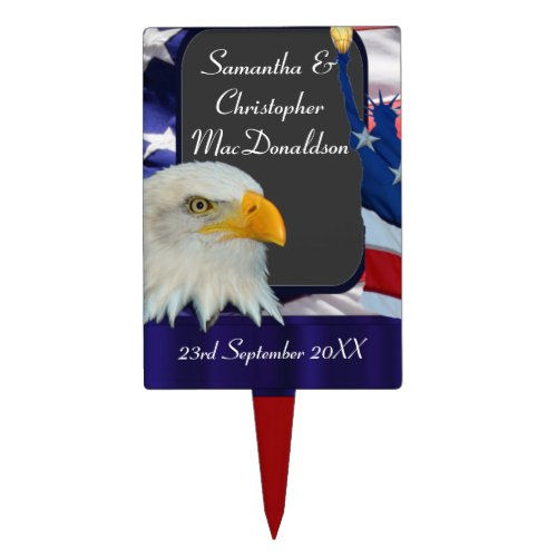 patriotic American style wedding Cake Topper products with good quality you can be confident patriotic American style wedding Cake Topper quality productsPatriotic American icon with a bald eagle and statue of liberty on a red white and blue flag of America formal wedding cake pick easily personalize the bride and grooms names or monograms to the templates to create a unique topper for your special american themed weddings or U.S.A. fourth of july or independence day occasions and celebrations. Visit the PERSONALIZED_ WEDDINGS STORE for matching coordinated wedding suite sets.