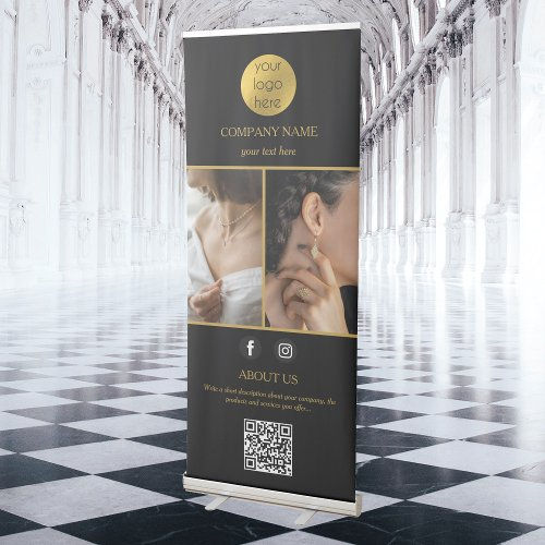 This item is trending! Elegant Jewelry Business Promotional 2 Photo Black Retractable Banner good product Elegant Jewelry Business Promotional 2 Photo Black Retractable Banner It’s in stock and ready to ship.A modern minimalist personalized retractable banner perfect for business. Customize the business logo text photographs and QR code and make it your own.