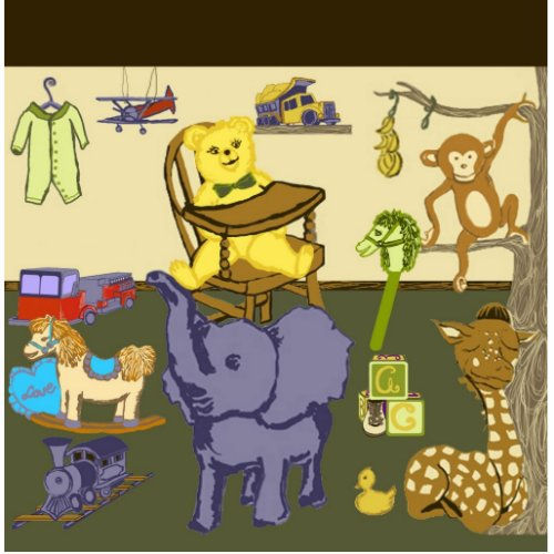 Baby Boys Nursery Toys In Room Ornament Sculpture quality over price Baby Boys Nursery Toys In Room Ornament Sculpture quality products and have the highest number of reviews in the same categoryBaby Boys Nursery Toys In Room Ornament Sculpture by Kristie Hubler with stuffed animals like teddy bear giraffe monkey elephant rocking chair hobby horse plus rubber duck and truck fire engine plane train and abc blocks highchair layette outfit and heart shaped pillow with the word "Love" embroidered on it.